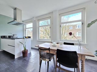 This furnished 120-square-meter apartment is located on the second and third floors of a 1934 building on Eemsstraat, in the heart of Amsterdam's Rivi…