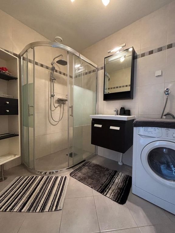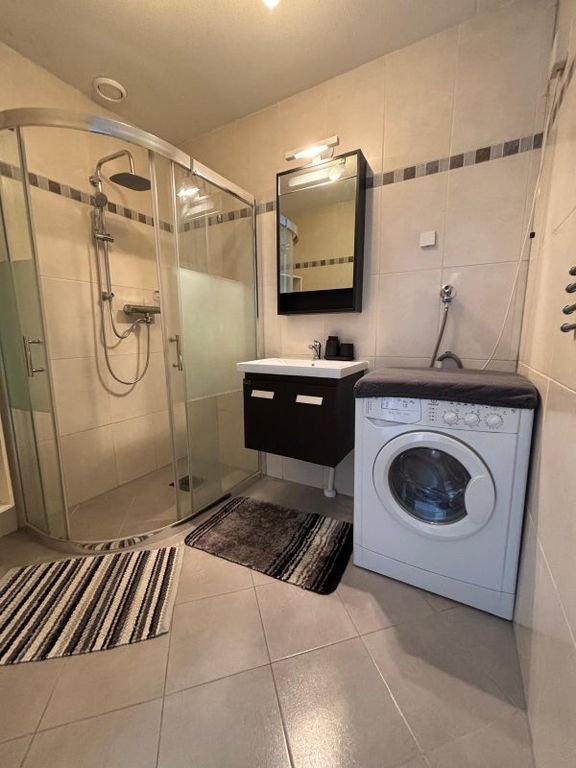 The property features a bright living room and a kitchen equipped with all modern conveniences. With built-in appliances such as a dishwasher, oven, refrigerator, freezer, and even a washing machin…