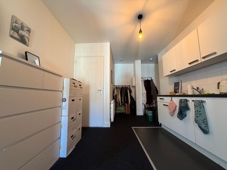 The living space is situated on the second floor at the rear of the building, offering a bit more peace and quiet than the street-facing side. You will have your own kitchen equipped with appliances including a hob, extractor hood, and a fridge-freezer. The bat…