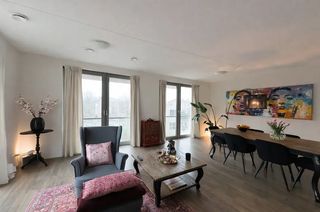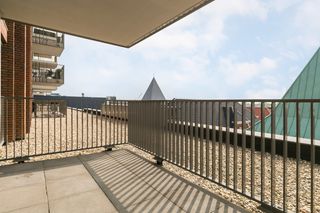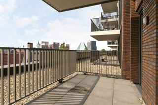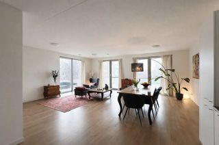 Dit driekamerappartement van 90 vierkante meter ligt op de vijfde verdieping van het complex New Orleans aan de Maashaven. Je kijkt vanuit de woonkame…