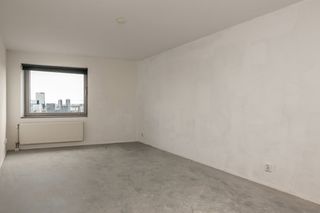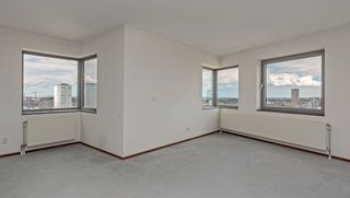 Dit appartement van 98 vierkante meter ligt op de 26e verdieping van woontoren De Hoge Heren in het Scheepvaartkwartier. Vanuit de woonkamer stap je d…