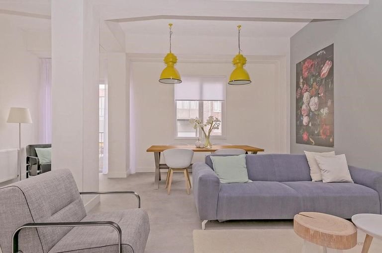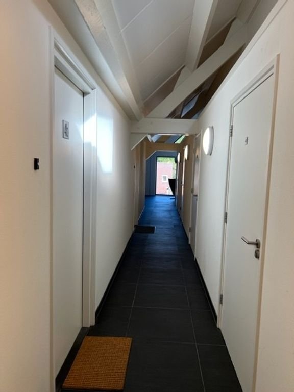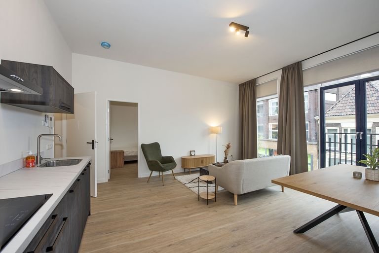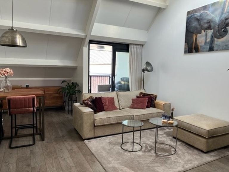 Het appartement is bereikbaar met de lift. Binnen kom je via de hal in de woonkamer met een halfopen keuken. Hier kook je op gas en heb je de beschikking over een…